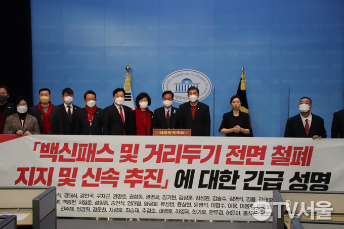 강압적인 문 정부의 백신접종 정책을 규탄하며 백신패스 전면철폐를 주장 국민의 힘 의원들 ⓒTV서울